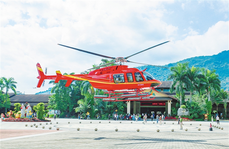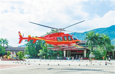 景区目前推出的直升机低空飞行旅游项目,直升机每架次可搭乘4—6人,飞行线路为呀诺达景区至三亚海棠湾区域,既能低空俯瞰风光旖旎的热带雨林,又能欣赏海棠湾海岸线。