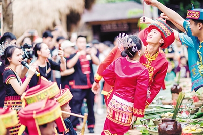 近年来,槟榔谷景区还先后推出“悠黎客”户外拓展基地、黎族传统婚礼巡游、夜游槟榔谷、篝火晚会等民俗体验项目。以“悠黎客”户外拓展基地为例,该项目为成人户外挑战、商务会议拓展、单位团队建设等多种客源设计了不同种类的拓展方案。活动囊括了趣味类、挑战类、明星体验类等多种形式,如水果竞猜、毕业墙、疯狂的椰子等。这些民俗旅游新体验活动的推出,让广大游客在体验“吃、住、行、游、购、娱”旅游六要素的同时,还能根据黎族文化设定的故事场景,让每一位游客都能参与其中做一回真正的“黎家人”,并在体验过程中留下难忘记忆,丰富旅行的乐趣。