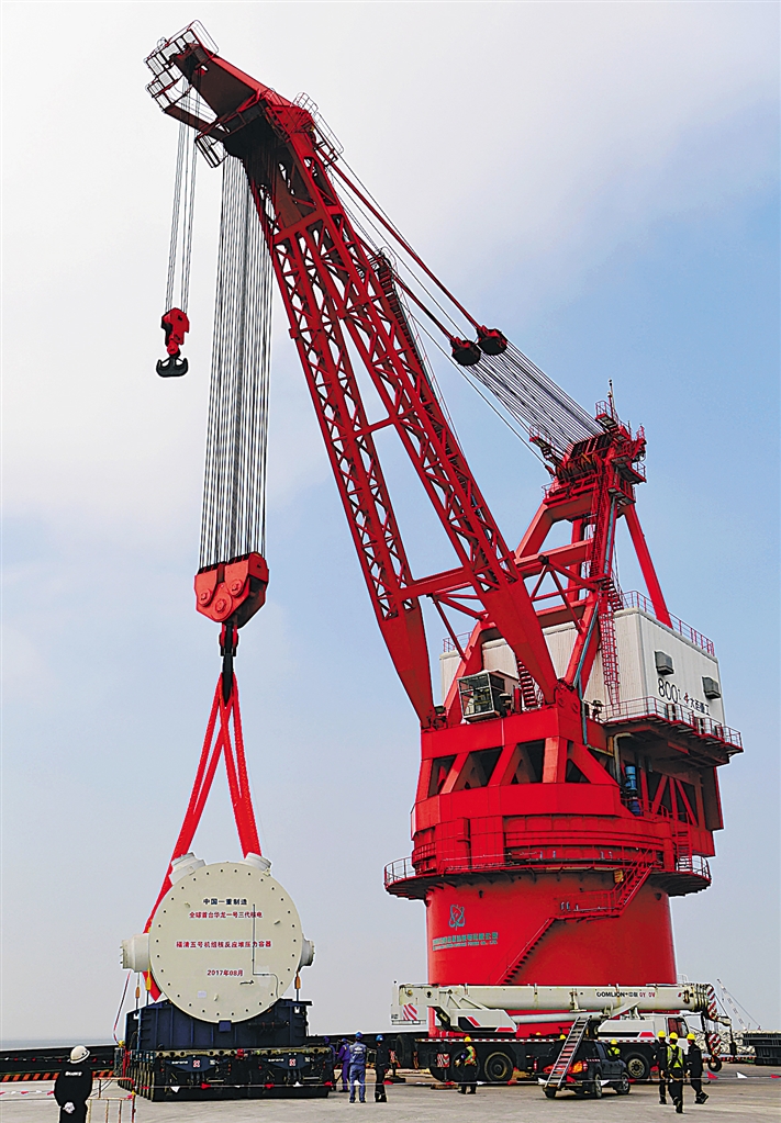 1月17日,在福清核电大件码头,工作人员将福清核电5号机组反应堆压力容器吊运到运输车上运往反应堆。 当日,“华龙一号”示范工程福清核电5号机组反应堆压力容器从大连港口运至福清核电大件码头开始吊装作业,预计本月底前安装就位。据介绍,与二代改进型机组相比,“华龙一号”示范工程压力容器采用全新177堆芯结构设计,设计寿命由40年延长到60年,抗震要求从0.2g提高至0.3g,安全性得到提升。 新华社记者 魏培全 摄