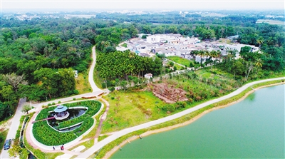 娇艳的红花绕着一池碧水,雪白的鹅卵石铺盖两旁,从高空中向下看,澄迈县金江镇宋岭村的这座小花园呈现出一颗“爱心”形状。而来自全村的生活污水,都在这颗“爱心”底下缓缓流淌,经过厌氧水解酸化等一道道工序净化后,再排入不远处的鱼塘。