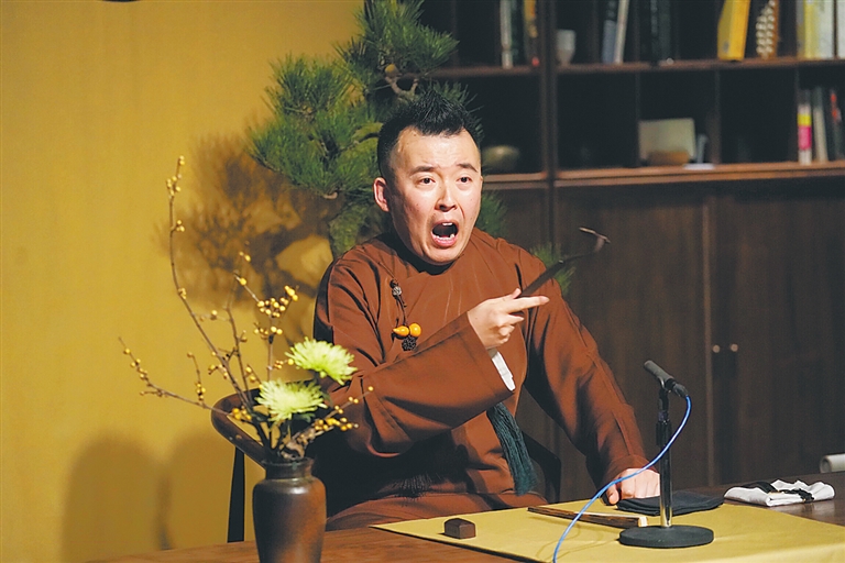1月20日,由吴荻表演的评书《再说西游》在北京人艺菊隐剧场开演,为观众带来了耳目一新的“评书2.0”剧场体验。图为吴荻在表演。