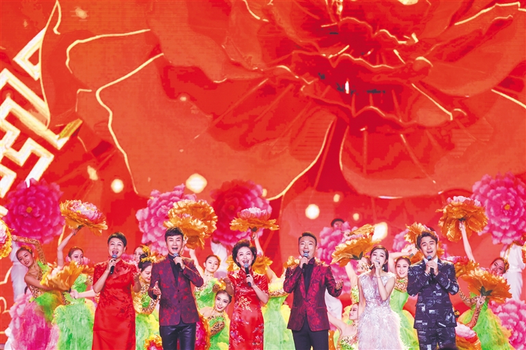 1月20日,由中国文学艺术界联合会主办的“百花迎春——中国文学艺术界2018春节大联欢”在北京国家会议中心举行。大联欢共分“春暖花开”“春风化雨”“春华秋实”“春光无限”四个篇章,文艺界老中青艺术家齐聚一堂,共迎新春。图为张凯丽、江涛、海霞、康辉、喻越越、翟天临(从左到右)在演唱歌曲《百花迎春》。 新华社记者 辛悦卫 摄