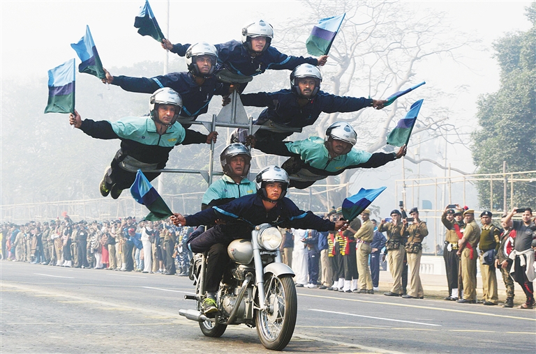 1月21日,在印度新德里,印度士兵参加共和国日阅兵排练。 1月26日是印度的共和国日。新华社/法新