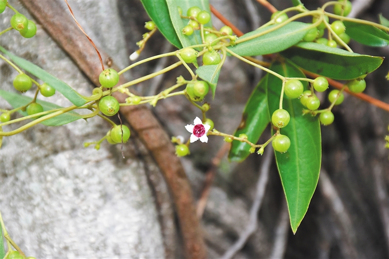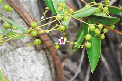 其实,鸡屎藤长得也没什么特别的,叶呈椭圆形,末端尖,茎蔓细长。王康传老师介绍说,鸡屎藤是茜草科植物,也叫“鸡矢藤”,平时人们采集鸡屎藤叶子,揉碎,用其汁液兑入面粉等原料,用来制作粑仔等小吃。