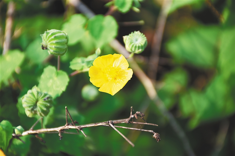 磨盘草来自锦葵科茼麻属“家族”,它的果呈圆形,周边嵌着竖条,整齐排列,确似磨盘。虽然果长得“奇形怪状”,但磨盘草的花长得“颇有颜值”,五个花瓣一开,黄橙橙的,有着晶莹剔透的温柔质感。