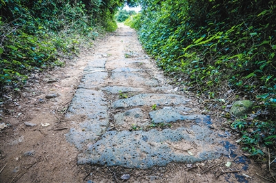 再往前走去,果然在泥土下发现了沿古道向东排列的石板,不知经多少代人的踩踏变得磨损不堪。今天的古道清幽宁静,只能从这残留的石板想象当年车马往来的忙碌盛景。