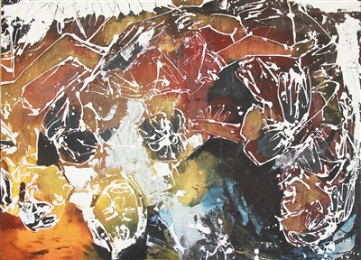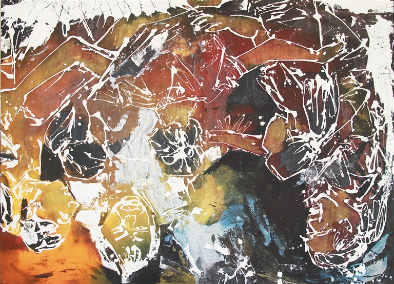 周乃林的抽象作品,是从中国画的角度去思考的。这次展出的作品,大都带有实验性质,是把中国画的理念融入蜡染制作中,将这些依靠手工技术的色彩碰撞与墨线勾勒纳入抽象绘画体系。他大胆地尝试蜡染制作与抽象绘画,将其方法用于色彩与墨线的勾画,以行为实验拓展艺术创新思路,强化画面视觉效果,扩展绘画表现语言空间,以使混于凌乱的画面改变困于笔墨规范的苍白。