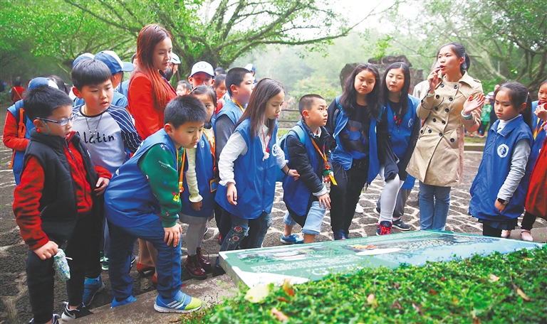 1月20日,在海口雷琼海口火山群世界地质公园,参加冬令营活动的上海小游客聆听了解火山岩知识。本报记者 张茂 摄