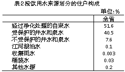 64.01万户的饮用水为经过净化处理的自来水,占51.6%;50.30万户的饮用水为受保护的井水和泉水,占40.5%;9.39万户的饮用水为不受保护的井水和泉水,占7.6%;1822户的饮用水为江河湖泊水,占0.1%;34户的饮用水为收集雨水,占0.003%;387户的饮用水为桶装水,占0.03%;1883户饮用其他水源,占0.2%。