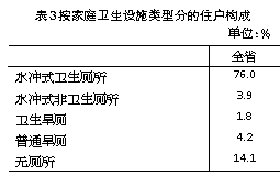 使用水冲式卫生厕所的94.31万户,占76.0%;使用水冲式非卫生厕所的4.88万户,占3.9%;使用卫生旱厕的2.18万户,占1.8%;使用普通旱厕的5.28万户,占4.2%;无厕所的17.47万户,占14.1%。