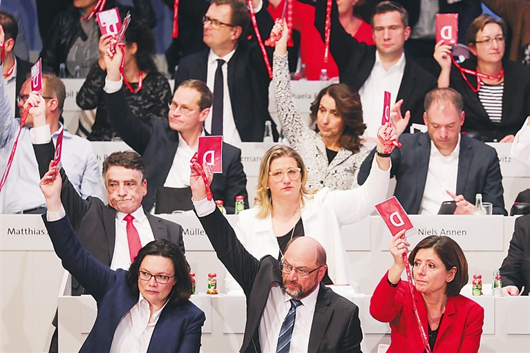 1月21日,在德国波恩,德国社民党主席马丁·舒尔茨(前中)与党代表们在特别党代会上举手表决。 德国议会第二大党社会民主党(社民党)21日在波恩召开特别党代会,表决同意该党与德国总理默克尔领导的联盟党进行组阁谈判。新华社/法新