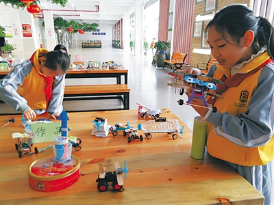 据海口市五源河学校副校长王妍妍介绍,科学课在该校二年级已经开展了2个月,学生们一共制作了190件科技作品。在该校学生科学作品展示区,记者看到了一个个用易拉罐、一次性纸杯、可乐瓶等物品做成的“小飞机”“农家小院”等科技作品,禁不住为孩子们天马行空的想象力所折服。