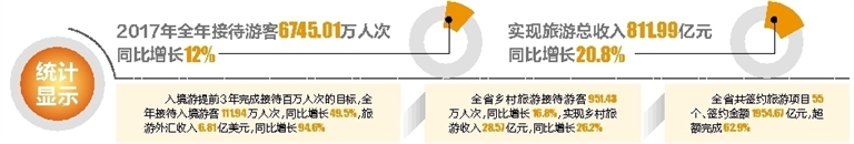 据统计,2017年接待游客6745.01万人次,同比增长12%,实现旅游总收入811.99亿元,同比增长20.8%,旅游经济发展质量效益显著提升,旅游收入增长明显高于接待游客数量增长比率。据旅游卫星账户测算,2017年旅游业对国民经济的直接和综合贡献度分别达到12%和28%。