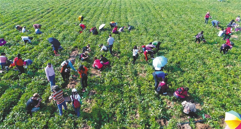 下午4时许,一群人来到红坎村地瓜基地里。“快点挖!我怎么找不到地瓜呢?”海口的陈女士一边在绿色的藤蔓下仔细寻找,一边招呼着自己的姐妹。她感慨道,在城市里整天面对钢筋混凝土的冰冷建筑,在田间挖挖地瓜,感受泥土的气息,真的十分快乐,可谓是“久在樊笼里,复得返自然”。
