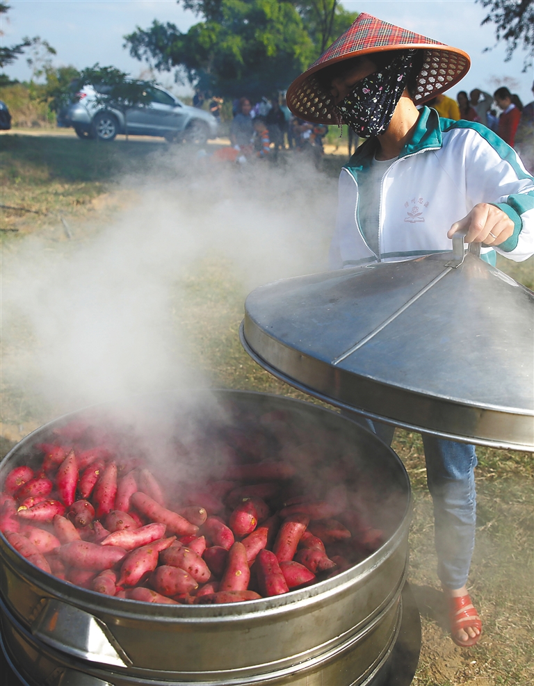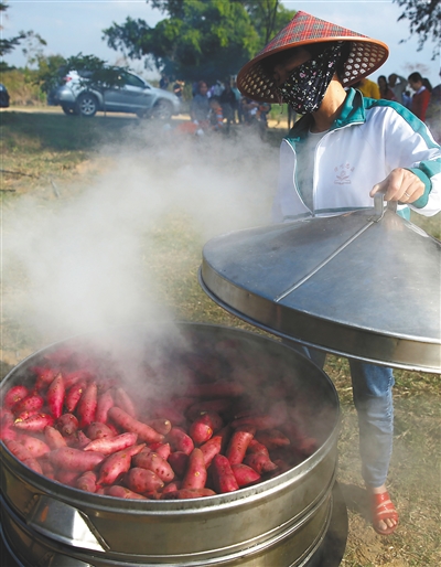 1月20日,海头镇的阳光格外明媚,一扫前几日的阴霾。为了让游客品尝地瓜的美味,现场工作人员为这次活动做了充足的准备,大蒸锅、铁锨……各种工具齐上阵。刚从地里挖出的地瓜沾着泥土,用水轻轻一冲,颜色红粉诱人,放在蒸笼上,香味让人垂涎三尺。而另一部分地瓜,则被放到了火堆旁,用来烤食。