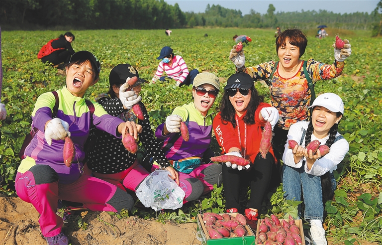 肩扛手提,满载而归。在短短一个小时的时间里,挖好地瓜的游客们已经装箱,兴致勃勃地准备拿回家蒸地瓜和烤地瓜。而此时,基地给游客准备免费品尝的蒸地瓜和烤地瓜也熟了,大家都互相分享自己收获的果实。
