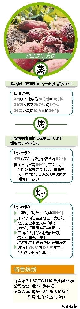 据蔡富强介绍,海头地瓜2015年开始试种,2016年正式推行“公司+农户+互联网”种植模式,在海头镇种植面积1500亩,2017年扩大种植面积到3000亩。如今,海头地瓜已经申请国家地理标识产品,现已列入儋州市九大特色农产品。2017年绿翠股份公司与儋州市政府共建的海头世界地瓜博览园项目正式启动。