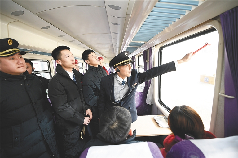 1月22日,列车长在银川至成都K1615次列车上对乘务员进行安全操作培训。 为迎接即将到来的春运,中国铁路兰州局集团公司银川客运段在列车上开展“备战春运”安全培训、演练活动,对列车员进行紧急安全操作规程演练、突发事件应急处置等培训,提高列车员的安全、服务意识。