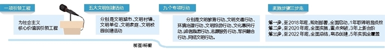 《实施方案》对开展社会文明大行动提出了3个阶段的实施步骤:第一步,至2018年底,规划部署,全面启动,1年取得明显成效;第二步,至2020年底,全面实施,重点突破,3年上新台阶;第三步,至2022年底,全面总结,常态创建,5年实现全覆盖。