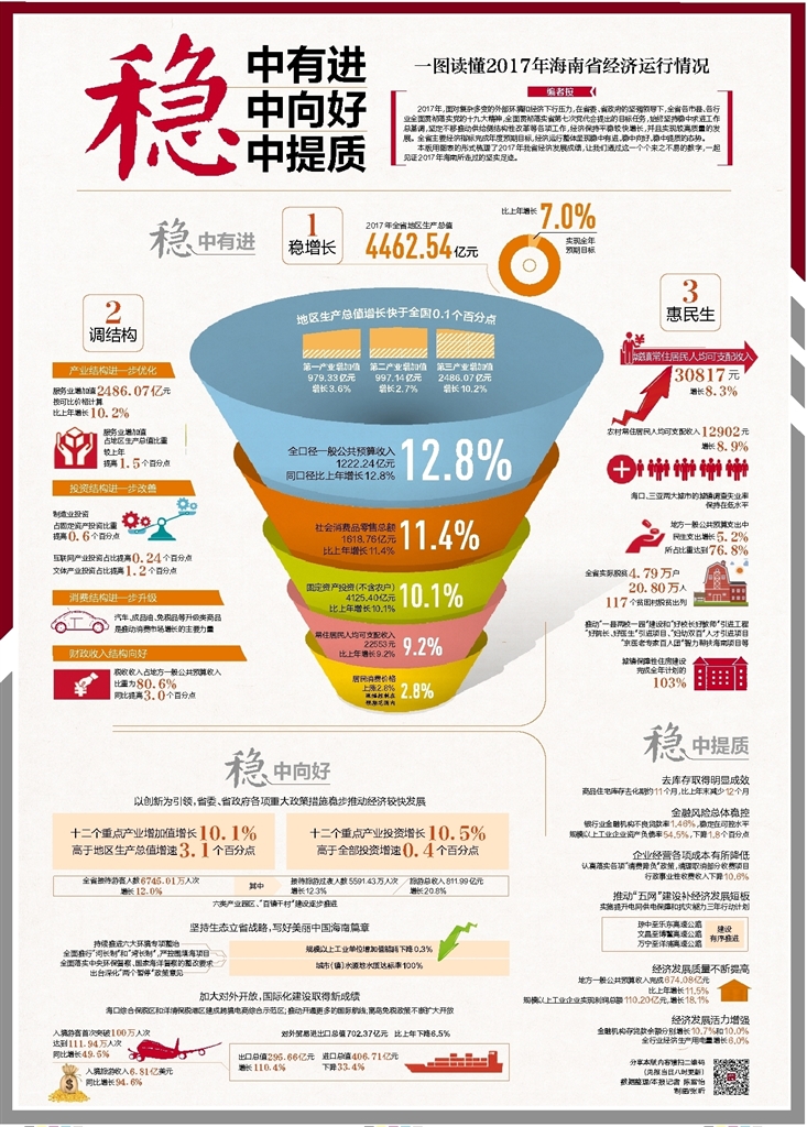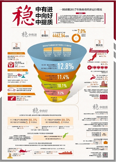 本版用图表的形式梳理了2017年我省经济发展成绩,让我们透过这一个个来之不易的数字,一起见证2017年海南所走过的坚实足迹。