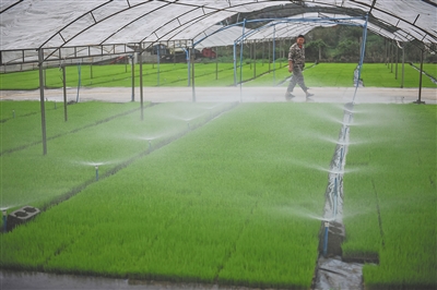 近日,位于文昌市东阁镇的文昌宝玉农机农民专业合作社,农户正在检查水稻集约化育秧中心的设备运行。