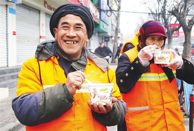 1月24日,在河北省邯郸市峰峰矿区街头,环卫工人喝上爱心企业赠送的腊八粥。 当日是农历腊月初八,各地爱心企业、志愿者等为人们带来热腾腾的腊八粥,送上寒冷冬日里的浓浓暖意。 新华社发(王健方 摄)