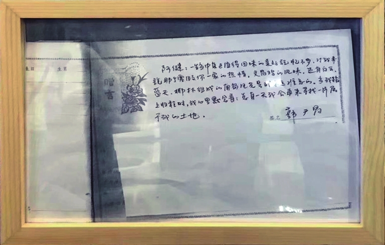 初见郭广昌,海南日报工作人员递上了一张相框框起来的大学毕业留言件,落款是“郭广昌”,成文于1989年6月,文中写着对海南的一语夙愿——“我心里默念着:总有一天我会再来寻找一片属于我的土地。”