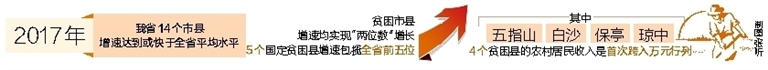值得一提的是,2017年,我省各市县农民收入首次全部超过万元大关,14个市县增速达到或快于全省平均水平。贫困市县增速均实现“两位数”增长,5个国定贫困县增速包揽全省前五位,其中,五指山、白沙、保亭、琼中等4个贫困地区农村居民收入是首次跨入万元行列。在收入构成方面,工资性收入和经营性收入保持了稳步增长,转移性收入和财产性收入高速增长,四大项收入呈现“双稳双增”增长态势。