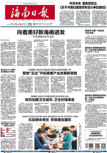 海南日报 头版 001 2018-01-251 2018年01月25日 星期四