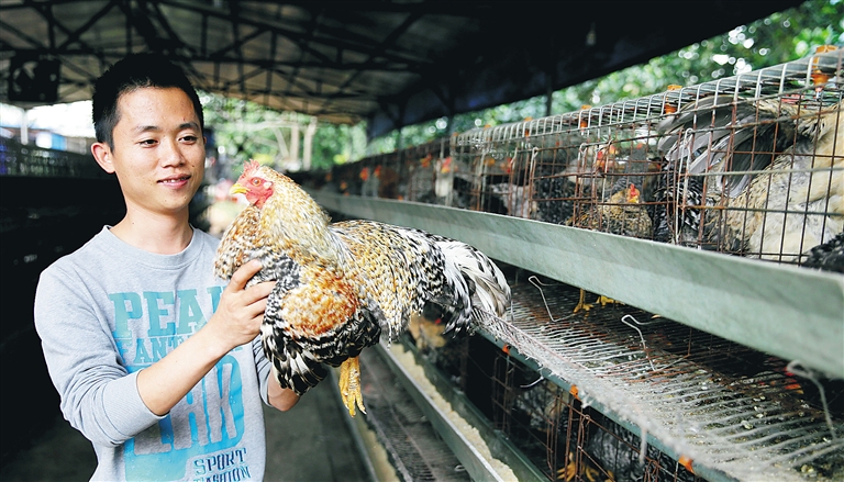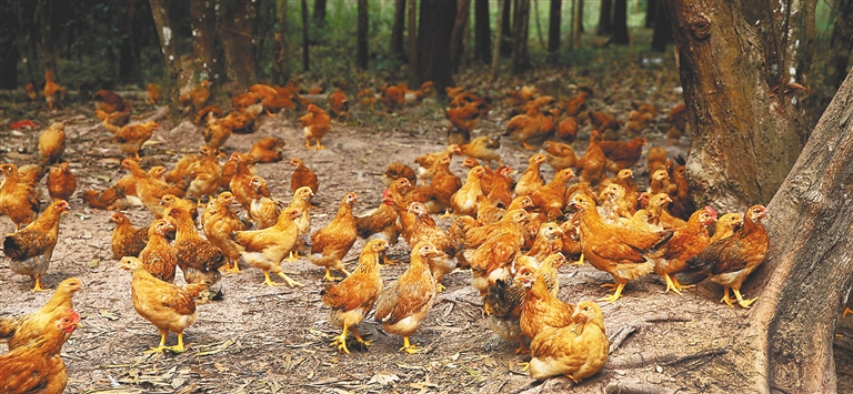 1月24日,澄迈县永发镇永灵村福鸡产业项目示范基地,澄迈衍旭种养专业合作社放养在树林里的6000多只50天大的雏鸡。 据悉,该合作社现有28栋鸡舍,每日可售出生鸡3000只,营业额超过9万元。“我们还将继续增设新鸡舍,预计到今年8月可实现自产自销。今年可以过个‘肥年’了。”基地负责人黄衍旭笑着说。