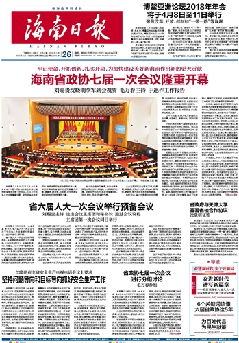 海南日报 头版 001 2018-01-261 2018年01月26日 星期五