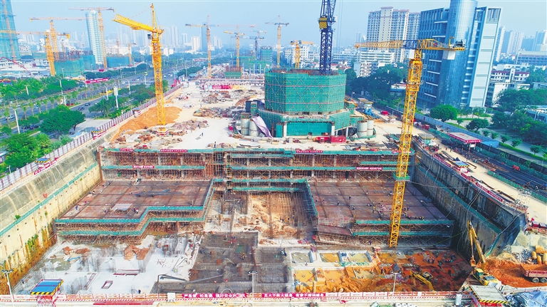 1月25日,记者站在海口双子塔·南塔项目工地上的不同方位,看到的施工景象明显不同。站在工地东侧向西望去,只见空中塔吊在不断运送建筑材料,地面上施工人员也在井然有序地施工;站在工地西侧向东望去,除了空中、地面上的繁忙景象外,地下的“大坑”中还有许多工人正在忙着建设地下室、停车场等。