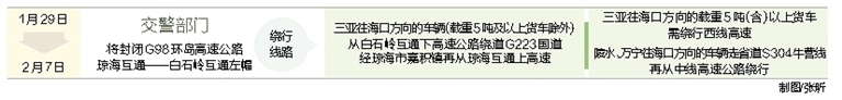 据了解,1月29日至2月7日,有关部门将封闭G98环岛高速公路琼海互通至白石岭互通左幅。受此影响,三亚往海口方向的车辆(载重5吨及以上货车除外)从白石岭互通下高速公路,绕道G223国道,经琼海市嘉积镇再从琼海互通上高速;三亚往海口方向的载重5吨(含)以上货车绕行西线高速;陵水、万宁往海口方向的车辆,走省道S304牛营线,再从中线高速公路绕行。