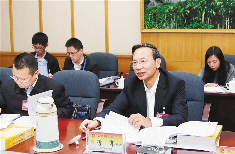 1月26日,参加省六届人大一次会议的代表们分组审议政府工作报告。李军代表参加万宁代表团审议。 海报集团全媒体中心记者 刘洋 摄