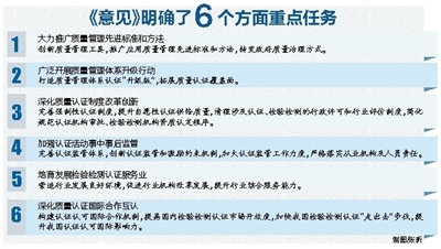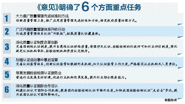 《意见》强调,要加强组织领导,地方各级人民政府要将质量认证体系建设纳入经济社会发展规划,建立健全议事协调机构和工作机制;各部门要高度重视,完善全国认证认可工作部际联席会议工作机制。要加强综合保障,加快相关立法进程,加强学科教育和专业人才队伍建设,完善统计分析机制和信息共享平台。要加强宣传引导,普及质量认证知识,提高全社会质量意识和诚信意识。要加强督促落实,推动各级政府将质量认证工作纳入政府绩效考核和质量工作考核,确保各项决策部署落地。