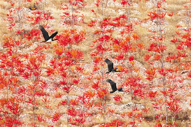 由于南水回补库区、汛期降水相对丰沛,北京密云水库蓄水量自2000年以来首次突破20亿立方米。日渐上涨的库水和清净的库区环境吸引了鸟类,近日在密云水库流域,水库工作人员拍摄到世界濒危珍禽——黑鹳的身影。 图为在密云水库流域,三只黑鹳飞过成片的水源涵养林。 新华社发