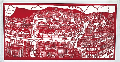 这也是一幅独一无二的剪纸作品,上面分布着上千个人物、数十个不同场景,不仅有飞机、游艇、汽车、豪宅,还有森林、高山、大海、良田……