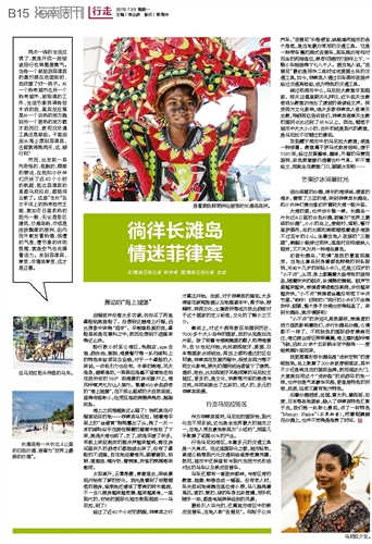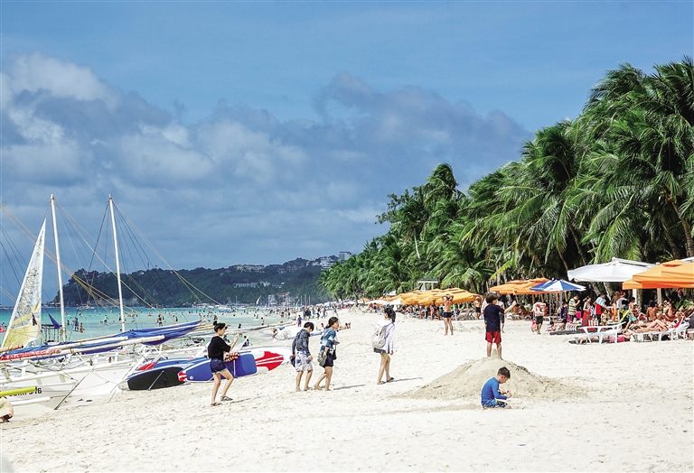 “小不点”的欢迎礼果然奏效,表演者的活力显然影响着我们,步行长滩岛沙滩,心情都不一样了。不同肤色的国际游客擦肩而过,海边商业街区熙熙攘攘,海上摩托艇呼啸飞驰,远处20余个五彩跳伞空中摇曳……度假氛围扑面而来。