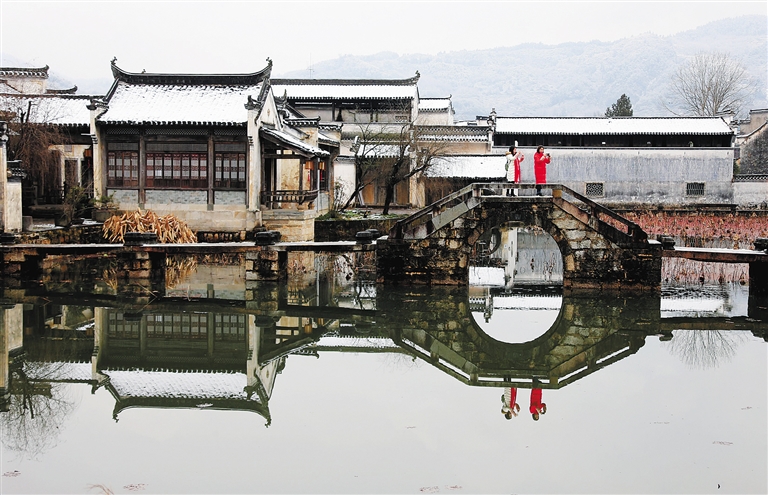 1月28日,在安徽省黄山市呈坎古村,游客在小桥上驻足拍照。雪花飘舞的时节,一抹红色映入眼帘,分外俏丽。 新华社发(施广德 摄)