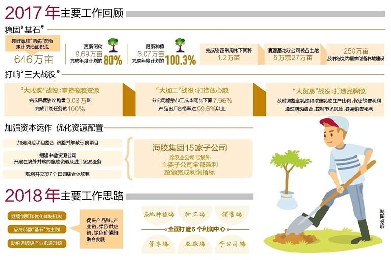 “2017年在公司全体员工的共同努力下,公司整体经营状况呈良性态势发展,基本完成了各项经营指标。但是我们也要清醒地看到,进入2018年,天然橡胶价格仍将处于变动调整中,基地胶工短缺问题在短期内无法得到彻底解决,将继续对干胶产量造成较大影响。”海胶集团执行副总裁谢兴怀认为,必须继续创新和优化体制机制,坚持以稳“基石”为主线,助推各板块产业迅速升级,全面打造6个利润中心,从而进一步优化盈利模式和主业架构。