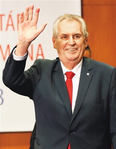 1月27日,在捷克首都布拉格,泽曼在赢得连任后向支持者致意。 捷克现任总统泽曼27日在捷克总统选举第二轮投票中,击败对手捷克科学院前院长德拉霍什,赢得连任。