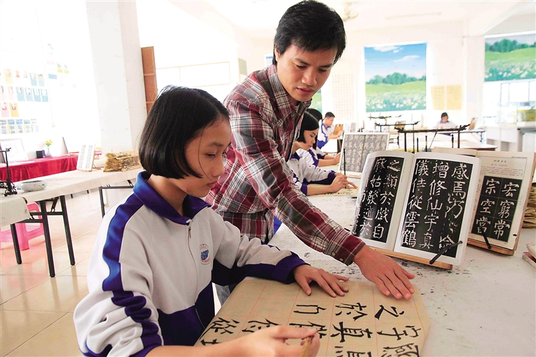 “很多学生刚接触书法时,都会觉得很新鲜,但是能否坚持下来就需要老师的引导了。”黄国贤表示。为了使学生们投入到书法学习中,他将书法与美育教学内容相结合,让优秀传统文化渗入校园生活中。