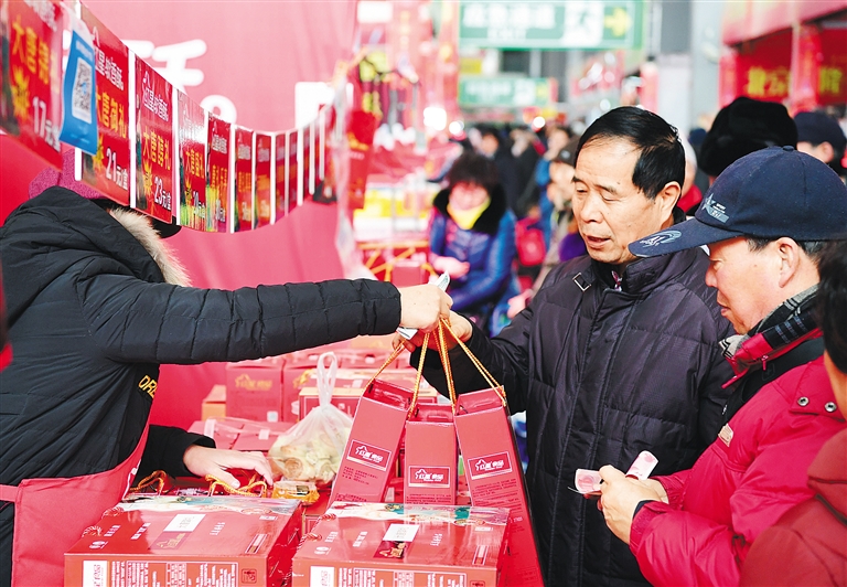 1月30日,市民在西安年货会上选购食品。 临近春节,不少西安市民来到在西安曲江国际会展中心举行的第16届西安年货会上选购,并体验独具特色的陕西年俗文化。新华社发