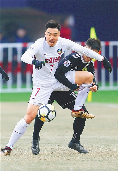 图为天津权健队球员赵旭日(左)在比赛中拼抢。 新华社发
