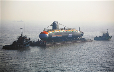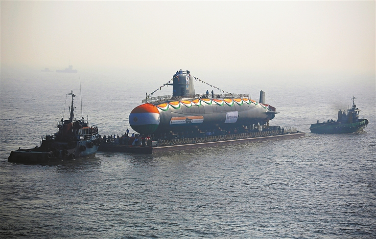 印度自行建造的第三艘“鲉鱼”级潜艇“卡兰杰”号31日在孟买海军基地下水。