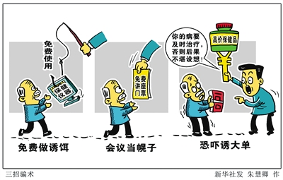 ——会议当幌子。记者了解到,一些保健品和保健仪器商家还针对老年人发免费培训讲座门票、组织免费旅游参观,以此“精准”推销。在外出封闭开会或者旅游的环境中,商家甚至现场软硬兼施强迫老年人交钱,不购买不让离开。