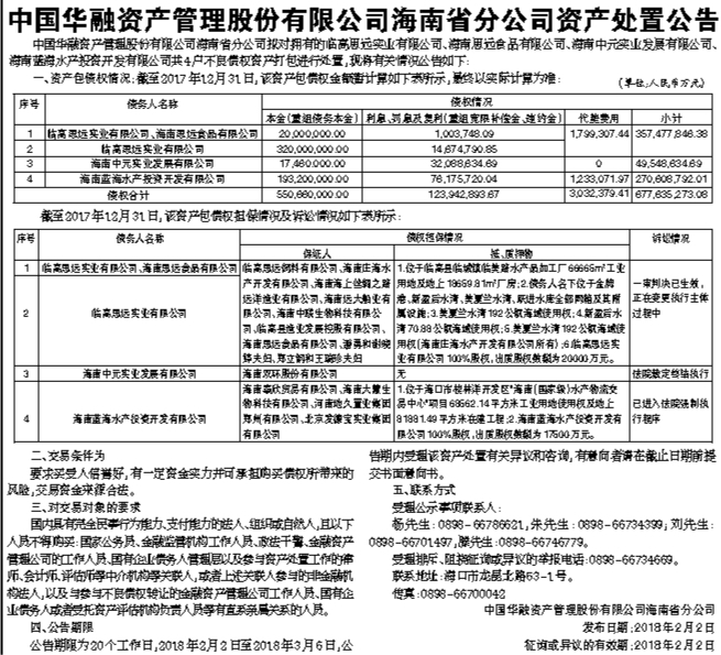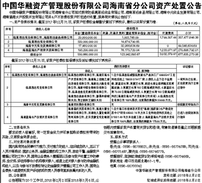 中国华融资产管理股份有限公司海南省分公司资产处置公告