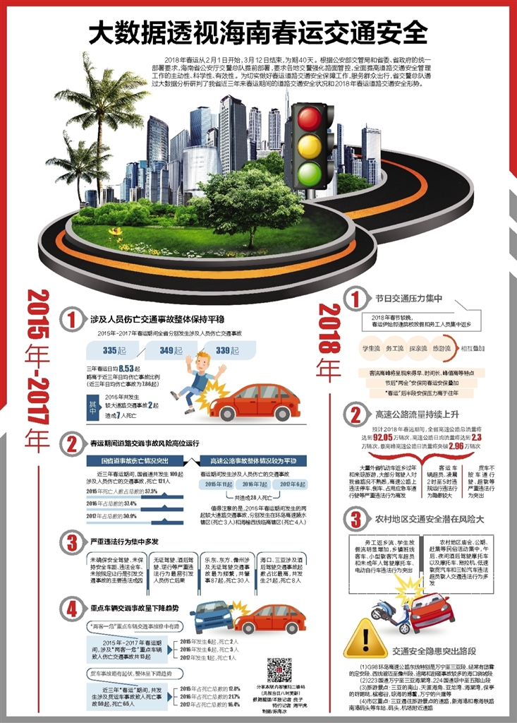 2018年春运从2月1日开始,3月12日结束,为期40天。根据公安部交管局和省委、省政府的统一部署要求,海南省公安厅交警总队提前部署,要求各地交警强化路面管控,全面提高道路交通安全管理工作的主动性、科学性、有效性。为切实做好春运道路交通安全保障工作,服务群众出行,省交警总队通过大数据分析研判了我省近三年来春运期间的道路交通安全状况和2018年春运道路交通安全形势。
