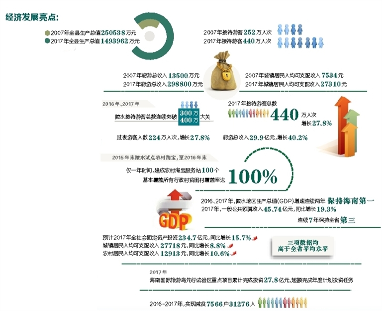 30载砥砺奋进,陵水硕果累累。2017年,全县实现地区生产总值149.3亿元、地方财政收入45.7亿元、农民人均纯收入12185元,增速飞快。