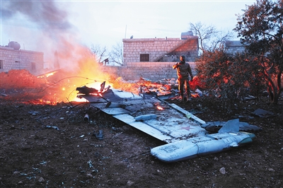 这是2月3日在叙利亚西北部伊德利卜省拍摄的被击落的俄军苏-25战机残骸。 俄罗斯一架苏-25战机3日在叙利亚西北部伊德利卜省执行打击极端分子任务时被便携式防空导弹击落,该战机飞行员成功弹射跳伞,并向俄军方报告跳伞位置在极端组织“征服阵线”控制区上空。随后,该飞行员在与极端分子交火中丧生。 新华社/法新